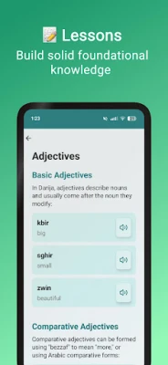 Neman ƙarin zurfin ilimi? DarijApp ya tsara abubuwan koyo a cikin sassan da suka shafi kalmomin yau da kullun, jimloli masu amfani, nasihun nahawu, da maganganun da ake amfani da su akai-akai a Darija. Wannan tsarin yana taimaka maka ganin yadda ake amfani da kalmomi a cikin mahallin gaske, yana sa koyo ya zama mai ma'ana da tasiri. Za ka koyi ba kawai abin da ake faɗa ba, har ma yadda ake faɗa da kuma lokacin da za a faɗa, yana mai da kai mai magana da Darija mai gaskiya da amincewa.