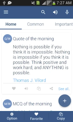 Kada ka rasa damar gwada iliminka ta hanyar "Word Quiz" mai matakai 24, inda kake buƙatar kammala kowane mataki ɗaya bayan ɗaya. Kuma idan ka yi kuskure, za a sake tambayarka a ƙarshen matakin. Ga waɗanda ke son gwajin gaskiya, "Mixer MCQ" yana ba ka damar tsara yawan tambayoyi da nau'insu. An raba muhimman kalmomi zuwa rukunoni 60, ciki har da sassan aikatau, karin magana, da jimloli, waɗanda zaka iya sarrafa matsayinsu. Har ila yau, zaka iya yin ajiyar tarihin kalmominka da zababbun kalmominka zuwa katin ƙwaƙwalwa sannan ka dawo da su a lokacin da kake buƙata. Hatta allon wayarka zai iya zama mai koyarwa tare da "Bangon Waya Mai Rai" wanda ke nuna kalmomi da ma'anoninsu, kuma zaka iya gyara launinsu, girman rubutunsu, da matsayinsu. Akwai kuma ɗimbin kalamai masu hikima waɗanda zasu iya canza rayuwarka.