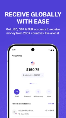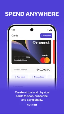 Tare da Raenest, buɗe asusun kuɗi na duniya (USD, GBP, EUR) a cikin mintuna kaɗan ba tare da takardu masu yawa ba. Karɓi kuɗi daga kwastomomi, kasuwanni, ko dangi a ƙasashe sama da 190 cikin sauƙi. Canza kuɗi nan take a farashin kasuwa na gaske, ba tare da ɓoyayyen kuɗi ba. Kari a kan haka, Raenest yana ba ka damar ƙirƙirar katunan USD na gaske ko na zamani (virtual) waɗanda ke aiki a ko'ina—daga Google Ads zuwa Upwork da sauran su—yana ba ka damar kashe kuɗi a duniya ba tare da wani hani ko kuma kuɗin mamaki ba, har ma da biyan kuɗi ba tare da taɓa waya ba ta Google Pay.
